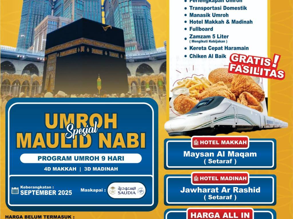 - Perlengkapan : Koper kabin, koper bagasi, tas paspor, kain ihram/mukena, sandal, buku manasik, kain seragam, syal, & sabuk